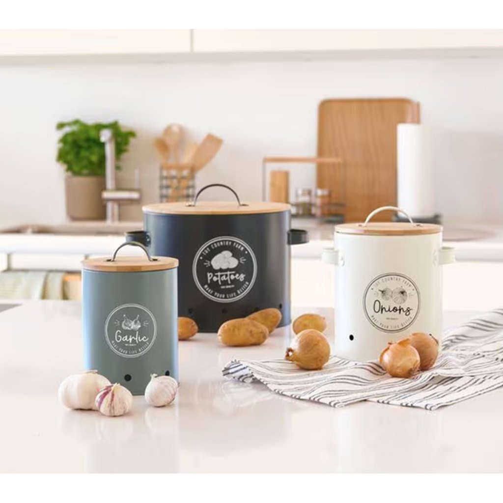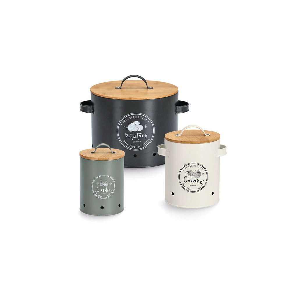 2. jakost - Sada 3 plechových dóz na cibuli, česnek a brambory s bambusovým víčkem FARM