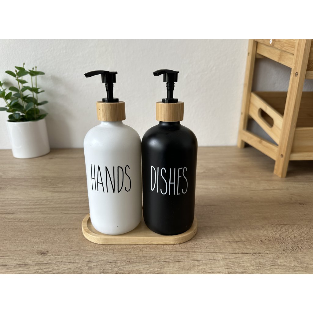 ✔ Součástí výrobku: 2 × dávkovač Ø 7,5 × 19,5 cm, bambusový podtácek