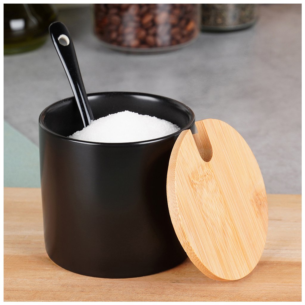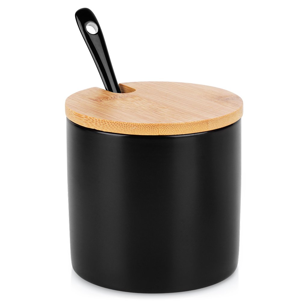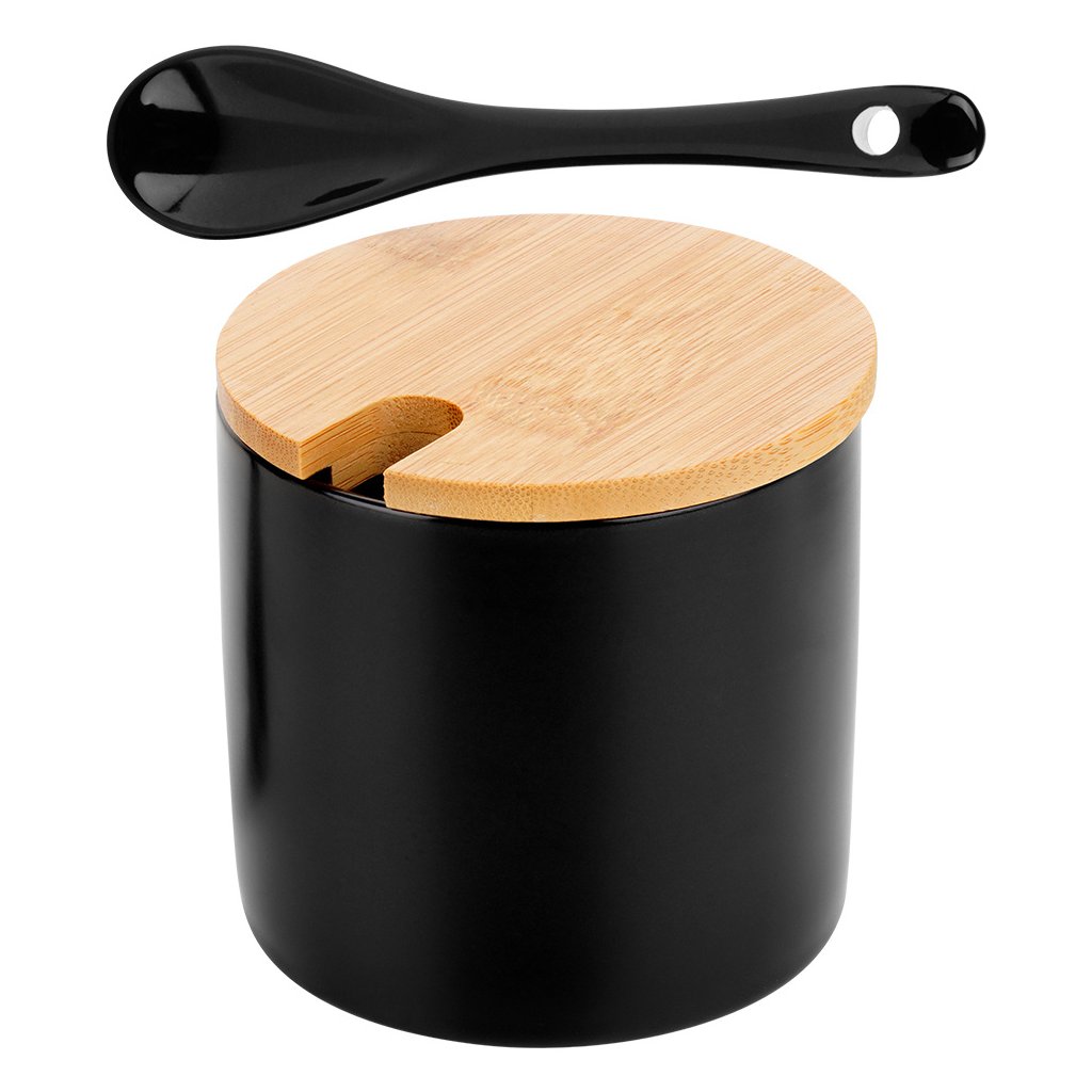Tato výrazná černá keramická cukřenka s odnímatelným víkem a lžičkou je ideálním doplňkem každé kuchyně či jídelny. Díky kombinaci kvalitní keramiky a bambusového víka je nejen praktická, ale také elegantní a stylová.