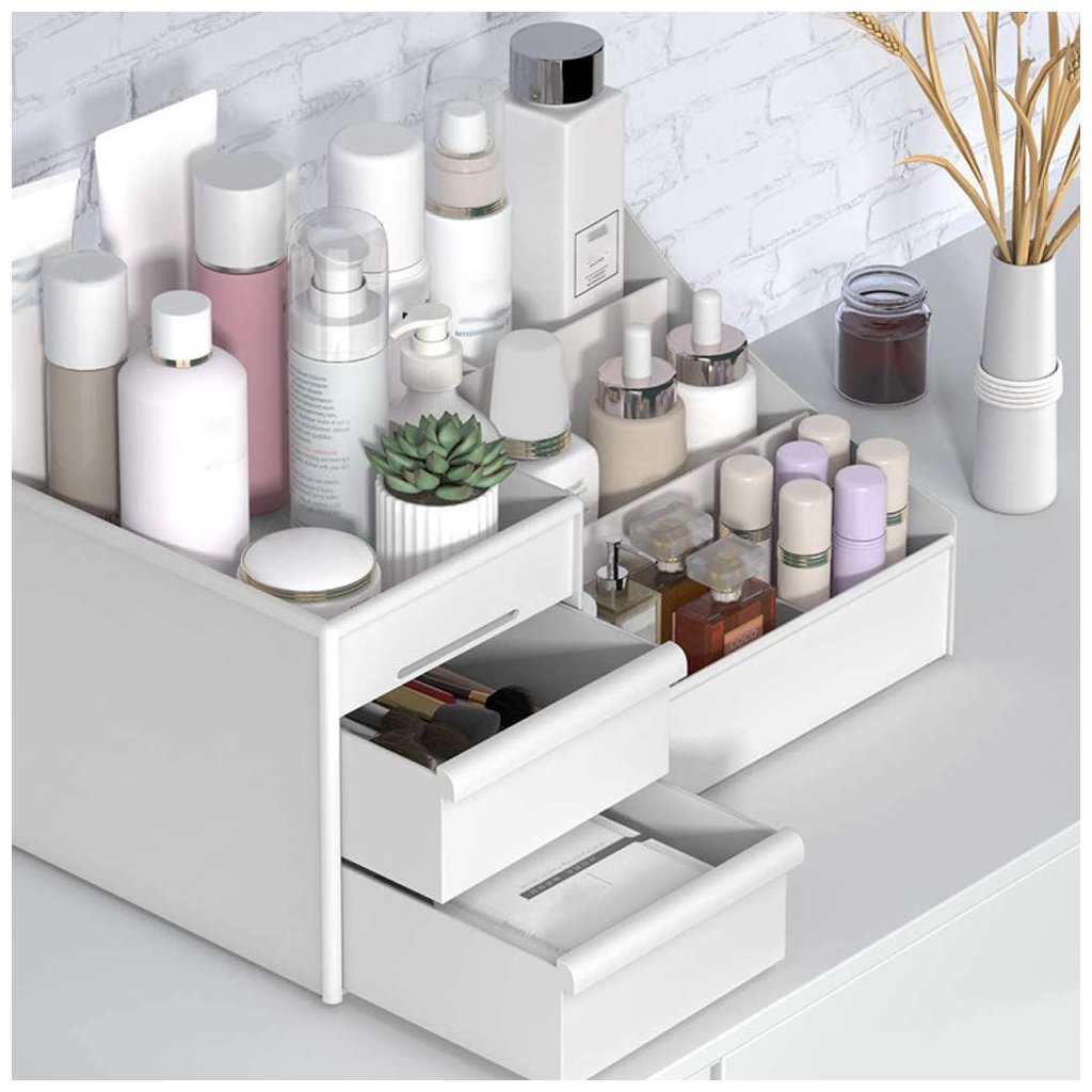 Tento praktický kosmetický organizér se dvěma zásuvkami a stupňovitým uspořádáním vám pomůže zorganizovat každodenní rutinu a zároveň ušetří místo na toaletce, v koupelně i v kanceláři.