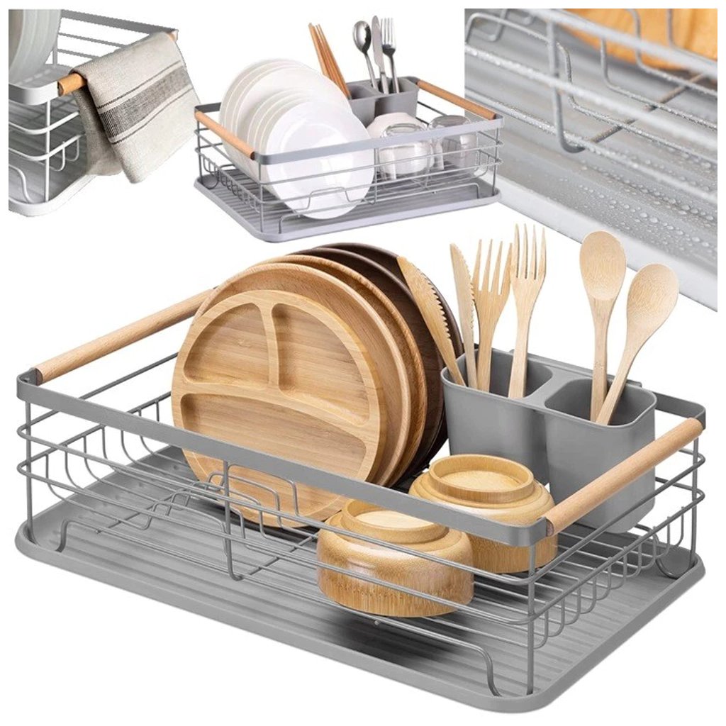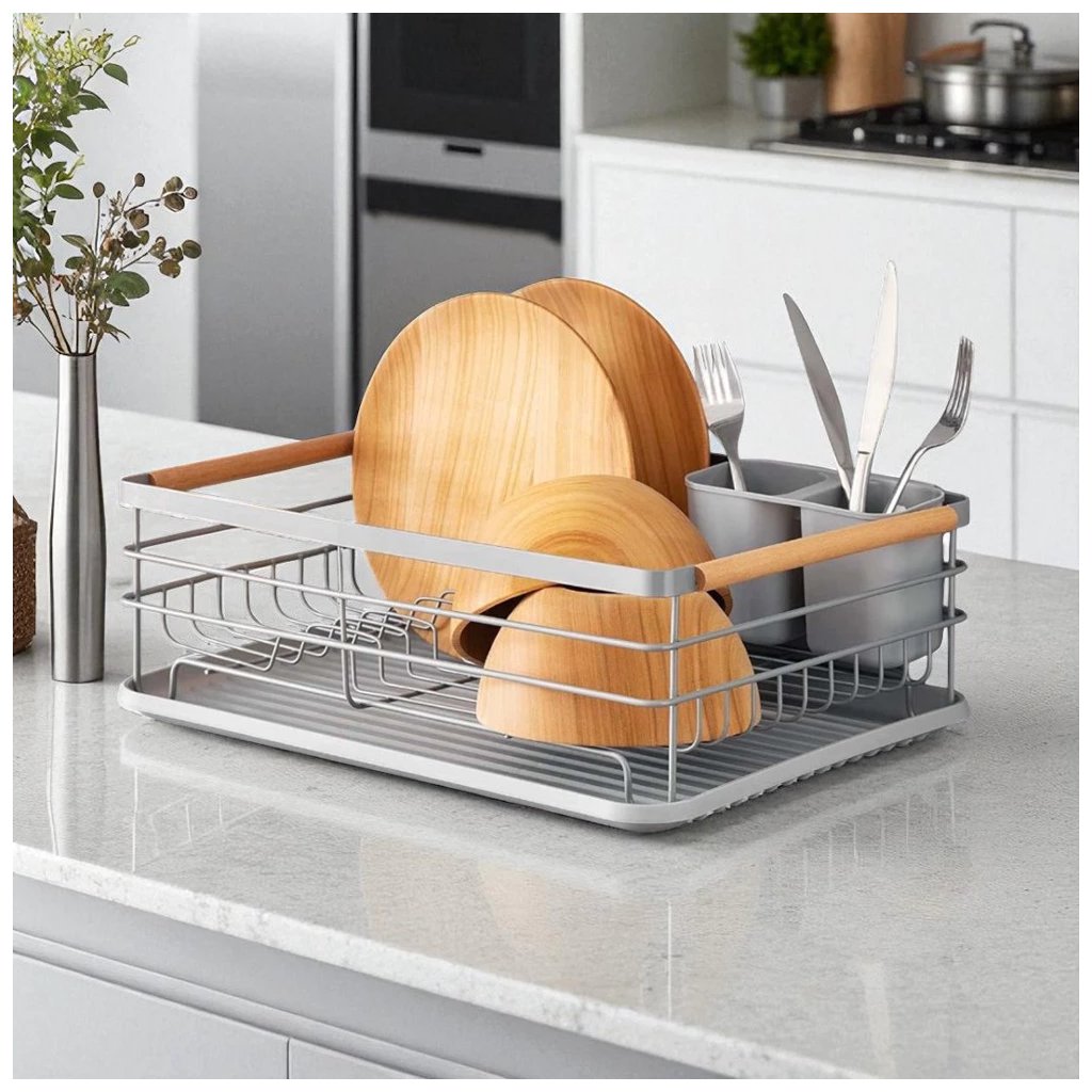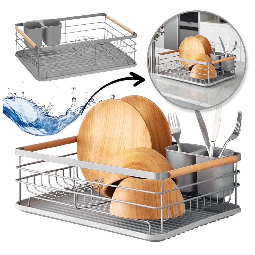 Konec nepořádku kolem dřezu! Tento stylový odkapávač na nádobí vám pomůže efektivně usušit talíře, šálky i příbory a zároveň udržet kuchyňskou linku suchou a organizovanou. Kombinace kovu, plastu a dřevěných prvků z něj dělá nejen praktického, ale i designového pomocníka! 💛
