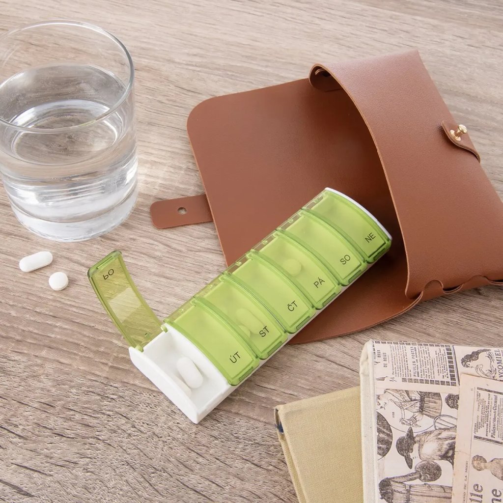 Dělený organizér na léky s českými názvy dnů v týdnu umožňuje přehledně připravit denní dávky léčiv. Každá přihrádka je vybavena průhledným víčkem a jasným označením dne, takže máte vždy dokonalý přehled. Celý organizér je uložen v elegantním koženkovém pouzdře, které chrání obsah a zároveň vypadá stylově.