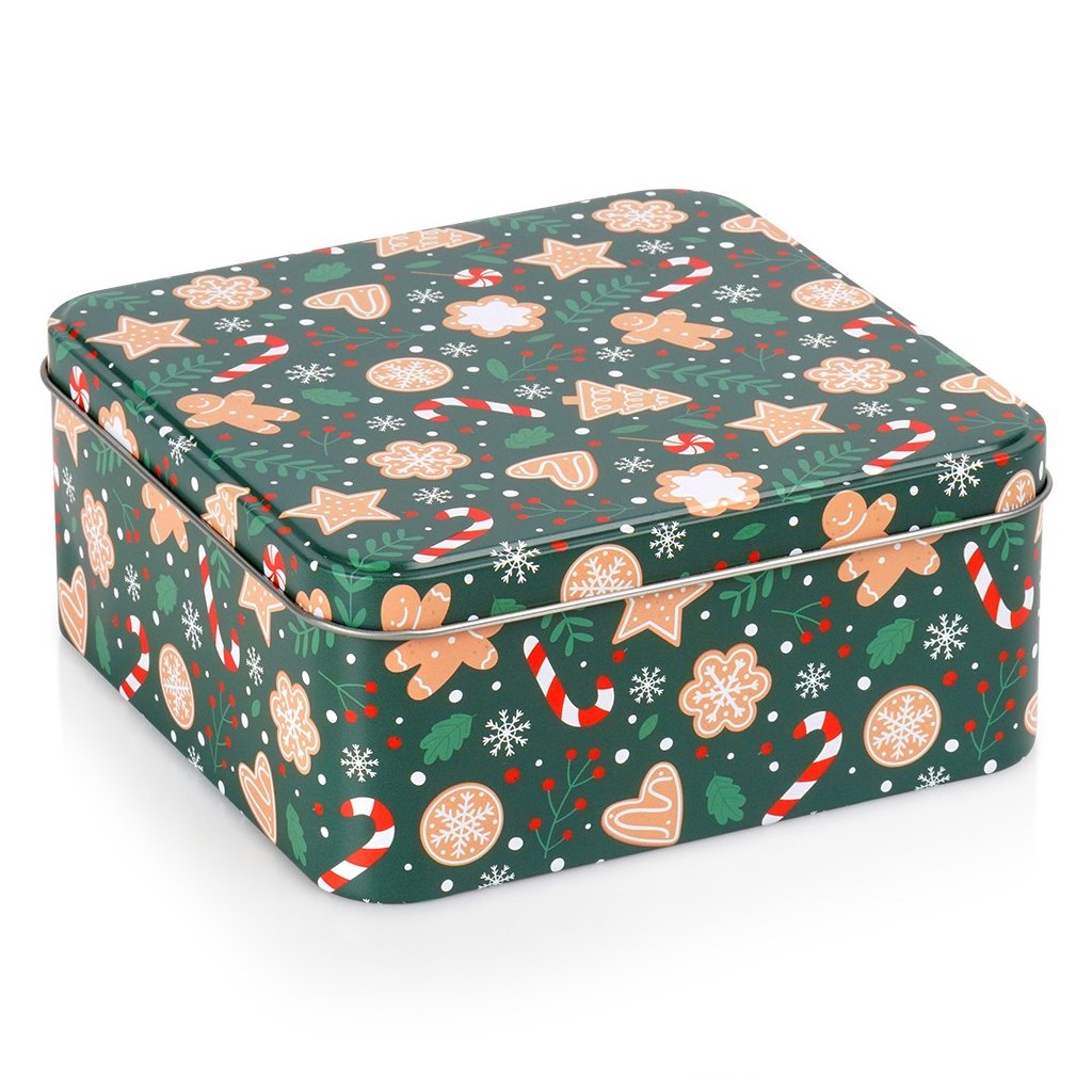 Uzavíratelná plechová dóza ve tvaru čtverce s vánoční ozdobou je ideální pro uchovávání sušenek, perníku, bonbónů, čaje i dalších drobností. Skvěle se hodí do kuchyně, kanceláře i jako stylová dárková krabička. Svým designem krásně doplní vánoční atmosféru.