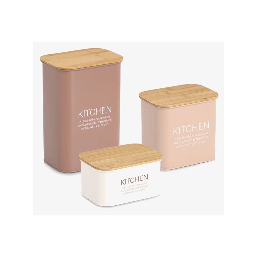 Stylová sada tří plechových dóz s bambusovým víkem je nejen praktickým úložným řešením, ale i krásným doplňkem do každé moderní kuchyně. Minimalistický design v jemných moderních odstínech a matné povrchové úpravě se hodí na otevřené police i pracovní desku. Vhodné na uložení kávy, čaje, cukru, mouky nebo sušenek.