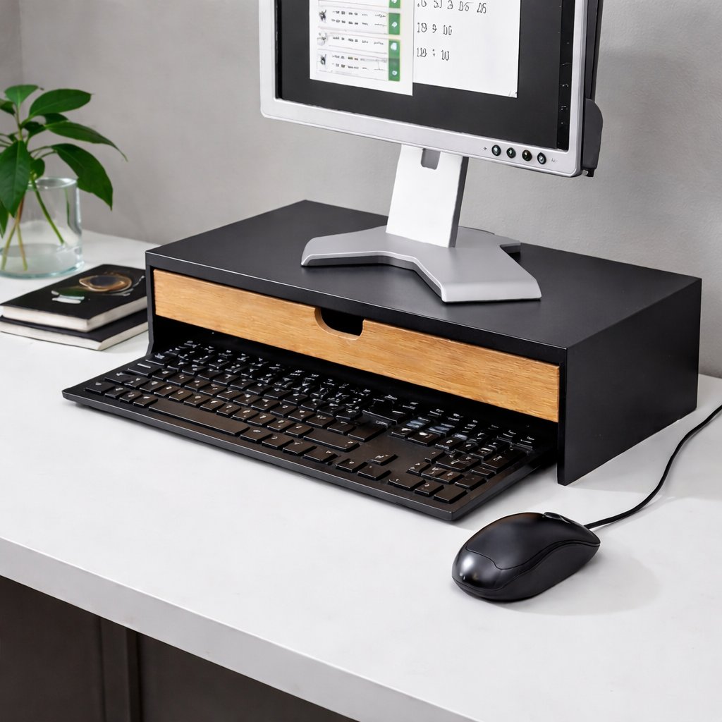 Součástí podstavce je praktická zásuvka na příslušenství, ideální pro uložení kancelářských potřeb, kabelů nebo drobné elektroniky. Díky tomu zůstane váš pracovní stůl přehledný a organizovaný. Minimalistický design se snadno sladí s kanceláří i domácí pracovnou.