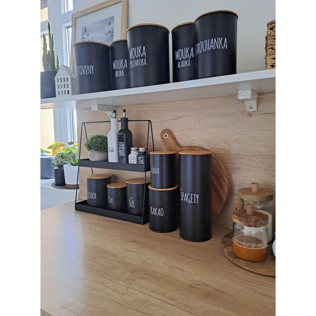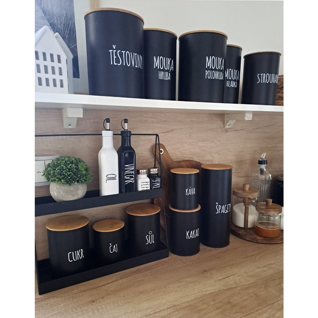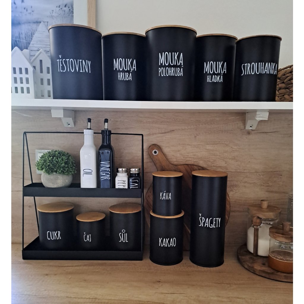 - Stylový design: Černé dózy s bílým nápisem se hodí do každého kuchyňského interiéru.