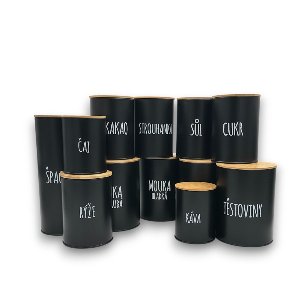 Tato sada 12 plechových dóz na potraviny s černým povrchem a bambusovými víčky je perfektním řešením pro skladování základních sypkých potravin, které nesmí chybět v žádné domácnosti. Každá dóza je označena českým nápisem, což usnadňuje orientaci a přispívá k estetice vaší kuchyně. Díky těsnícím bambusovým víkům se silikonovým kroužkem zůstanou potraviny déle čerstvé a chráněné před vlhkostí. S touto stylovou sadou můžete udržet pořádek na kuchyňské lince i ve skříňkách, a vytvořit tak harmonický vzhled kuchyně.