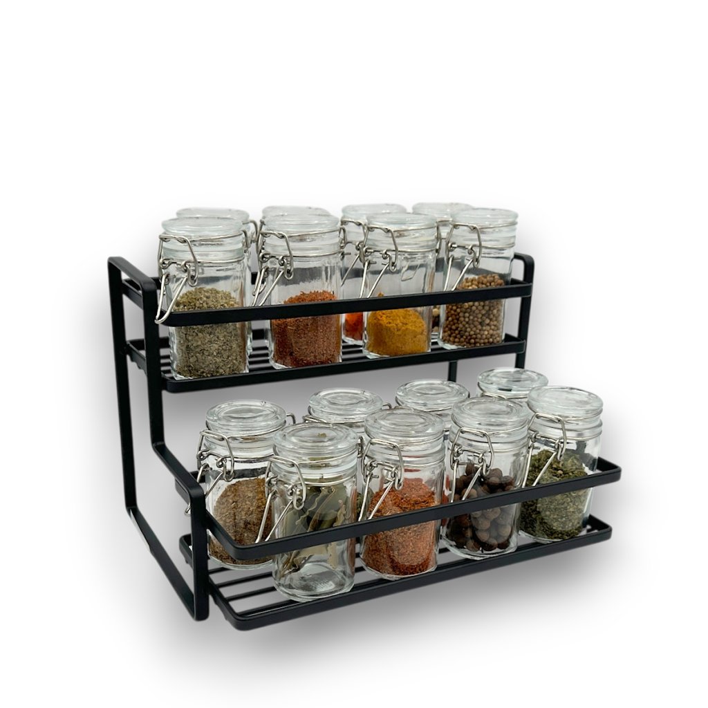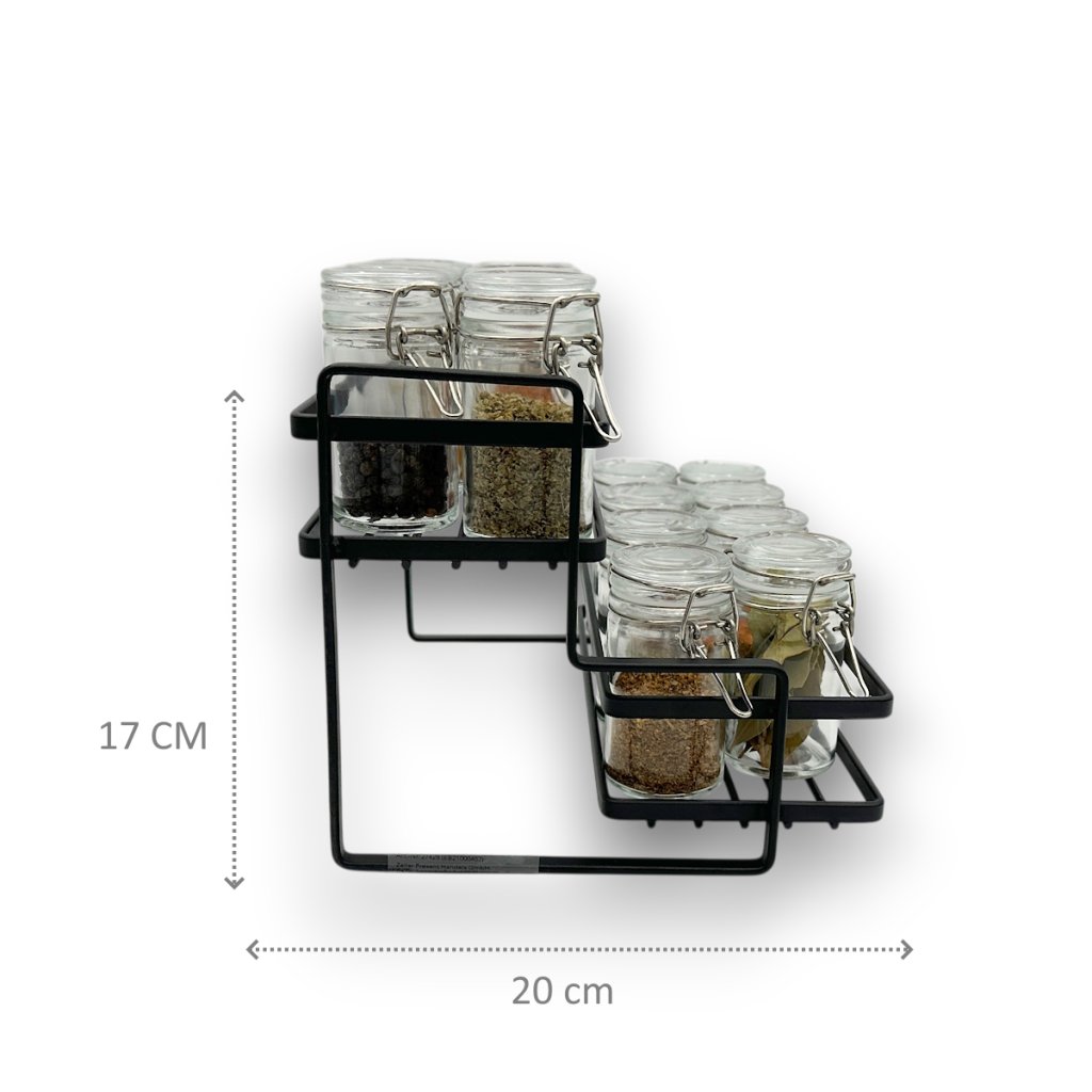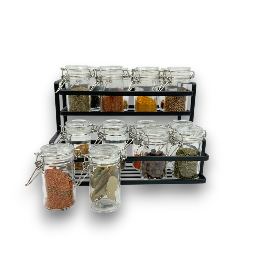 Tato praktická a elegantní sada spojuje funkční dvoupatrovou kovovou polici a 16 skleněných kořenek Hermes s kovovým klipem. Perfektní řešení pro každou kuchyň, kde záleží nejen na přehlednosti, ale i na stylu. Díky kompaktním rozměrům a elegantnímu provedení se sada hodí do moderních i klasických interiérů.