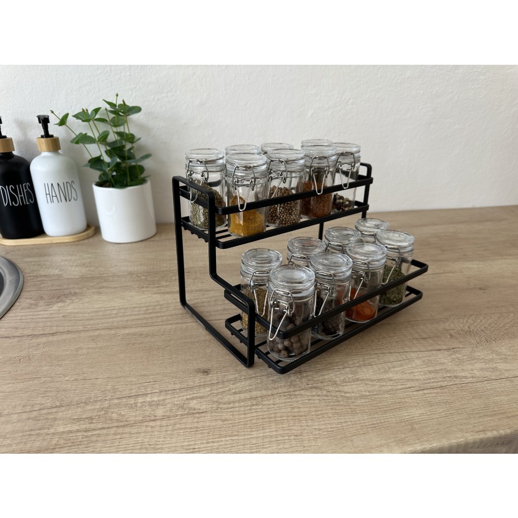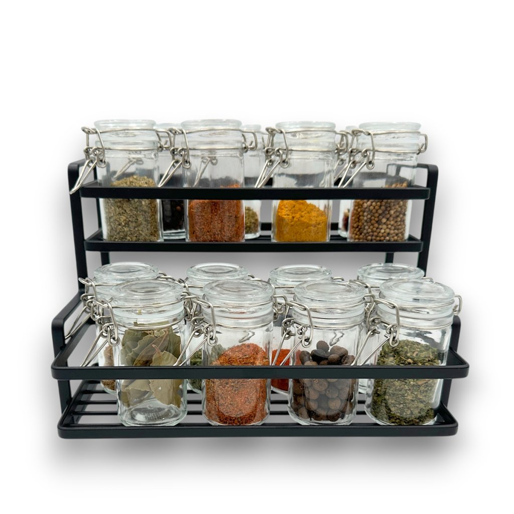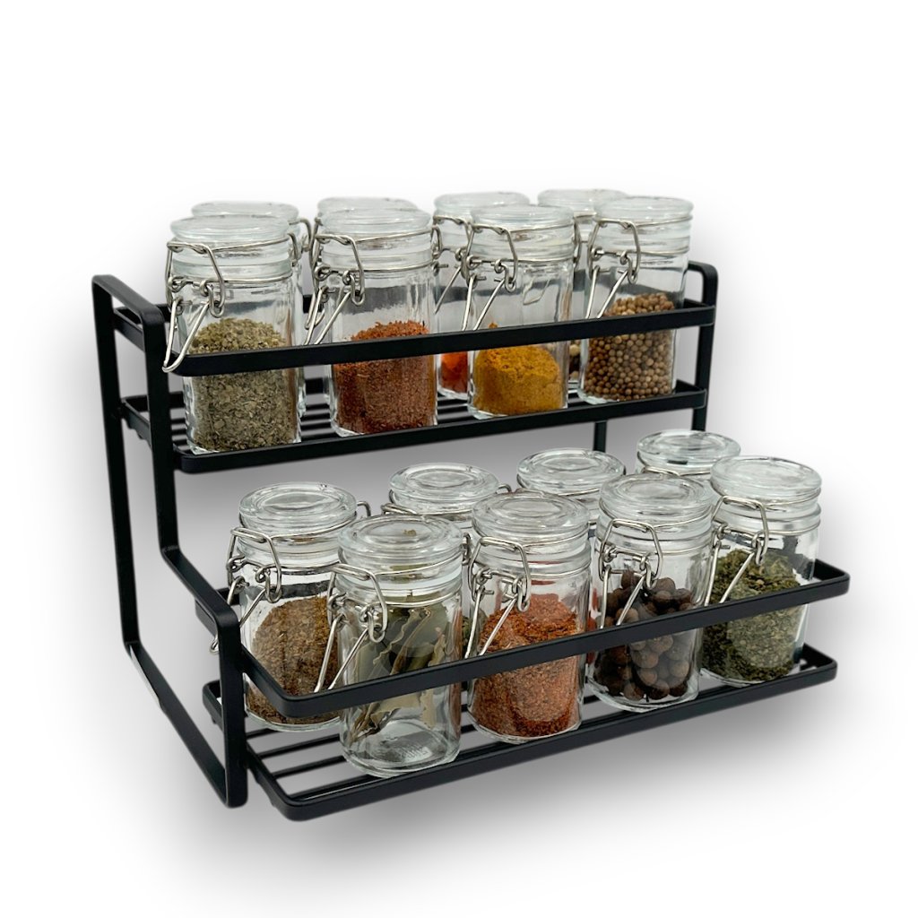 Tato praktická a elegantní sada spojuje funkční dvoupatrovou kovovou polici a 16 skleněných kořenek Hermes s kovovým klipem. Perfektní řešení pro každou kuchyň, kde záleží nejen na přehlednosti, ale i na stylu. Díky kompaktním rozměrům a elegantnímu provedení se sada hodí do moderních i klasických interiérů.