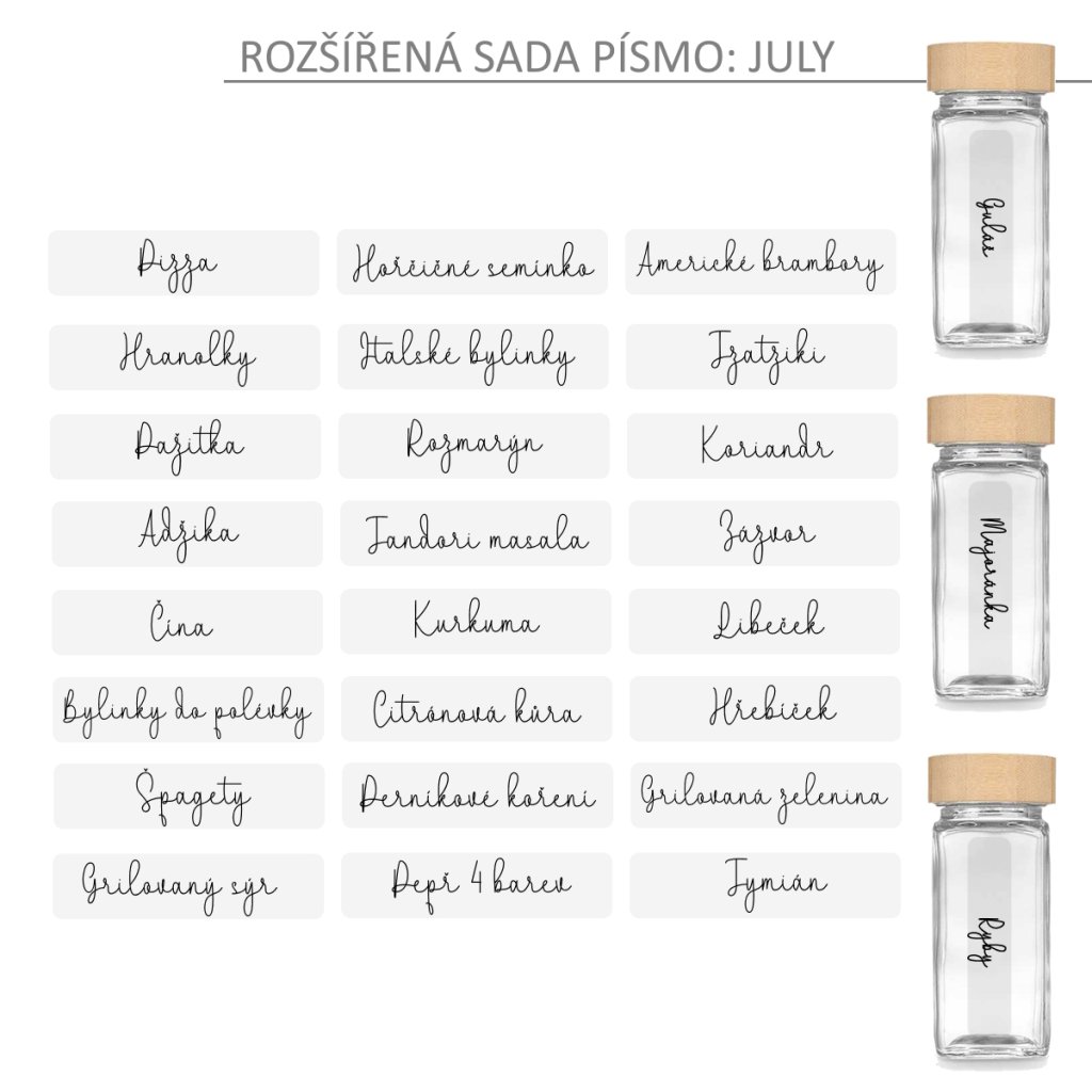 - Rozšířená sada štítků obsahuje tyto názvy: (Pizza, Hranolky, Pažitka, Adžika, Čína, Polév. bylinky, Špagety, Gril. sýr, Hořčičné sem., Italské bylinky, Rozmarýn, Tandari masala, Kurkuma, Citronová kůra, Perníkové koření, Pepř 4barev, Am. brambory, Tzatziki, Koriandr, Libeček, Hřebíček, Gril. zelenina, Tymián, Zázvor).