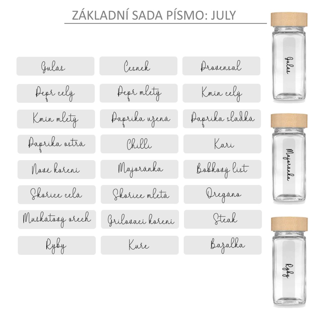 - Základní sada štítků obsahuje tyto názvy: (Guláš, Česnek, Provensal, Pepř celý, Pepř mletý, Kmín celý, Kmín mletý, Paprika uzená, Paprika sladká, Paprika ostrá, Chilli, Kari, Nové koření, Majoránka, Bobkový list, Skořice celá, Skořice mletá, Oregáno, Muškátový oř., Grilovací koření, Steak, Rypy, Kari, Bazalka).