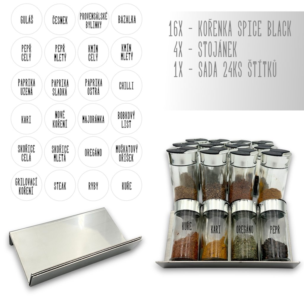 Sada 16ks kořenek SPICE BLACK 100ml + 4ks nerezový organizér na kořenky VASKY - NEREZ + sada 24ks štítků