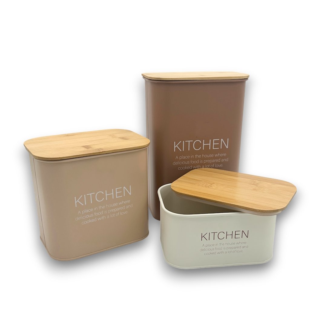 Stylová sada tří plechových dóz s bambusovým víkem je nejen praktickým úložným řešením, ale i krásným doplňkem do každé moderní kuchyně. Minimalistický design v jemných moderních odstínech a matné povrchové úpravě se hodí na otevřené police i pracovní desku. Vhodné na uložení kávy, čaje, cukru, mouky nebo sušenek.