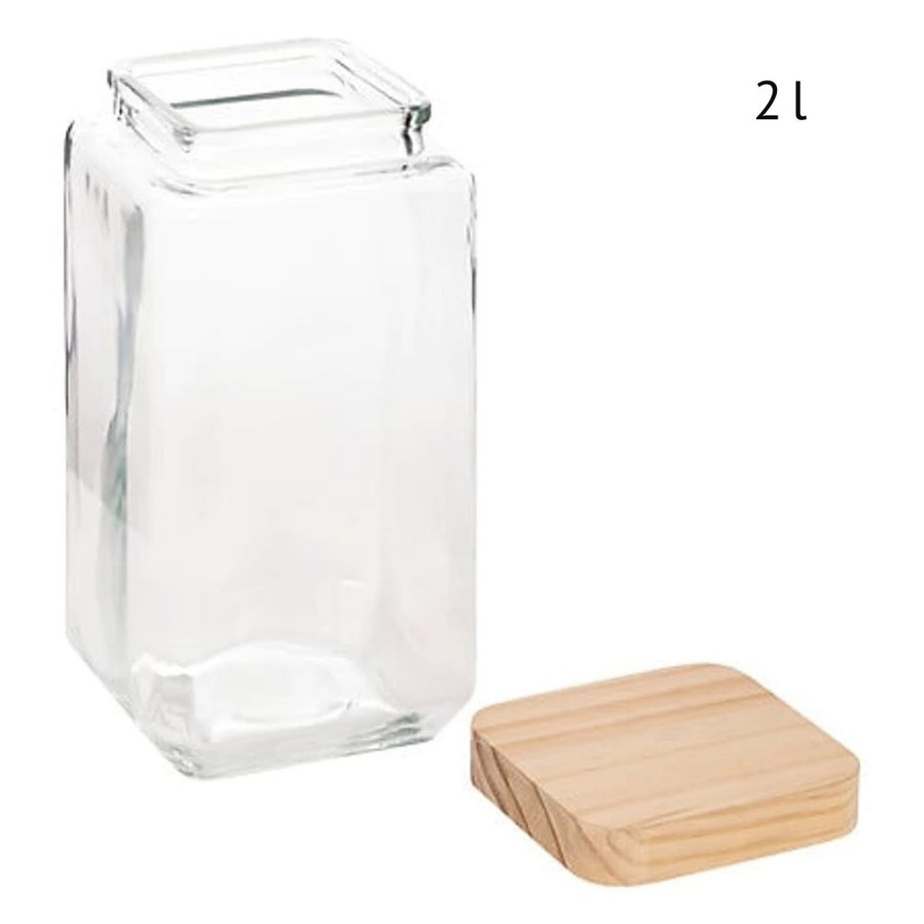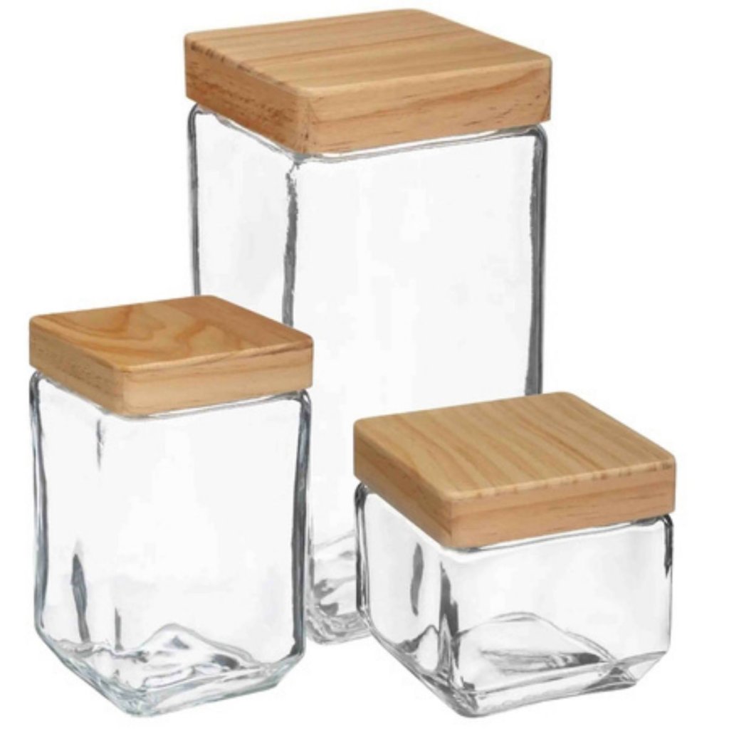 Sada 3ks skleněných bytelných hranatých dóz s dřevěným víkem, 2l KWADR