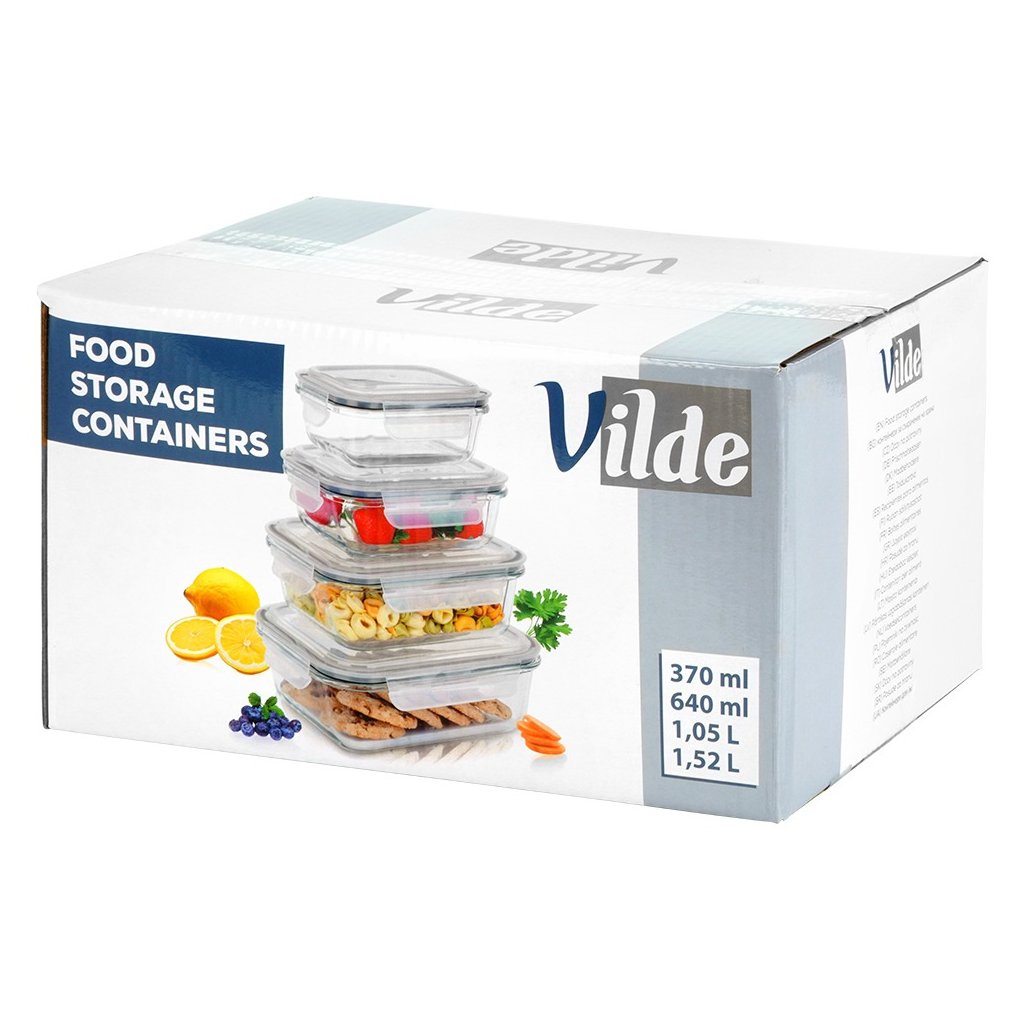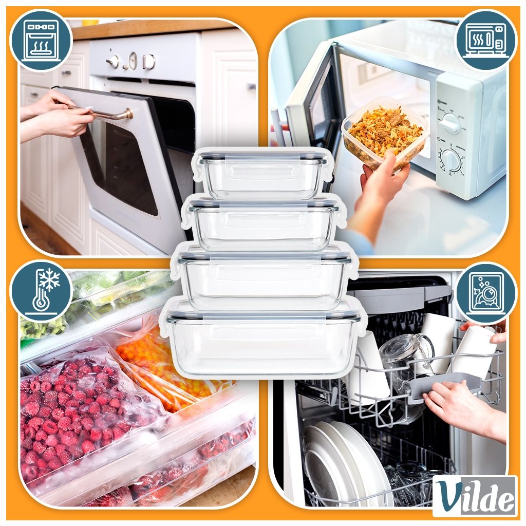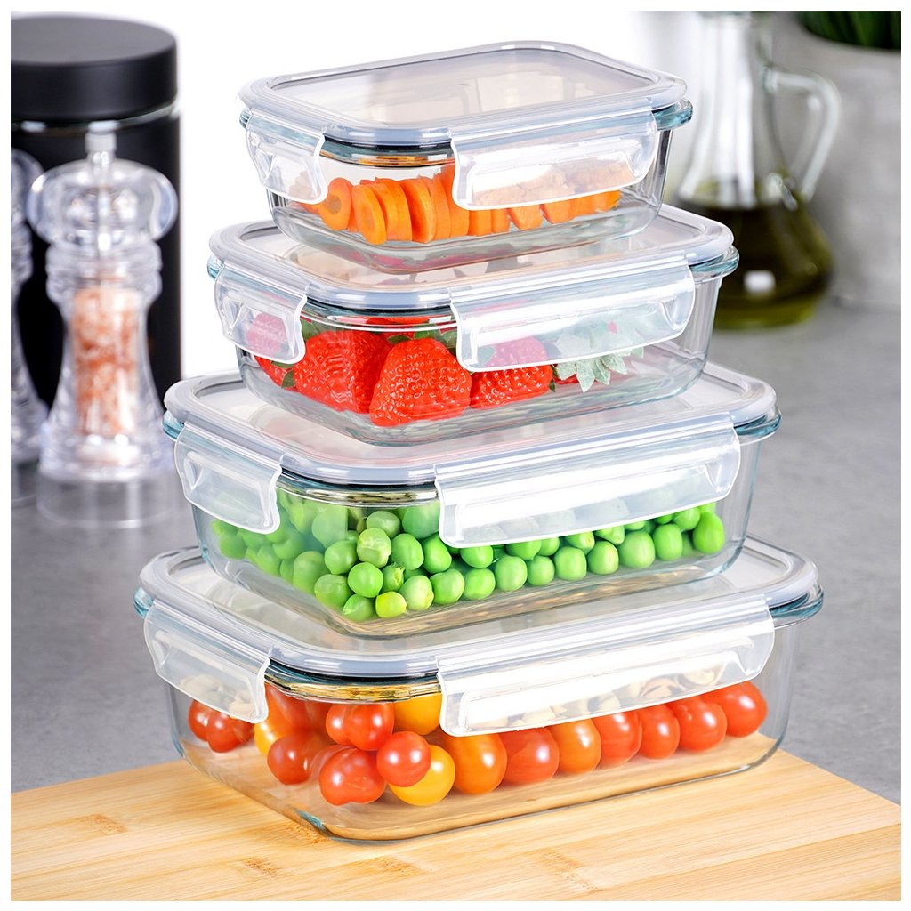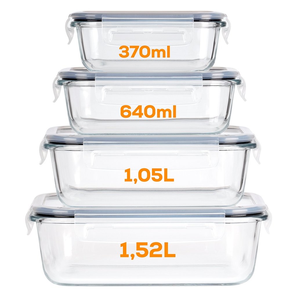 Suché potraviny, zbytky jídel, saláty, přílohy, svačiny – každá kuchyně potřebuje systém pro uchovávání jídla. Tato praktická sada 4 nádob z borosilikátového skla vyřeší vše najednou. Různé velikosti, vzduchotěsné uzavření a možnost použití v troubě i mrazáku z nich dělají ideálního pomocníka pro domácí skladování i přenášení jídel. Nádoby lze také pohodlně stohovat do sebe, takže nezaberou téměř žádné místo.