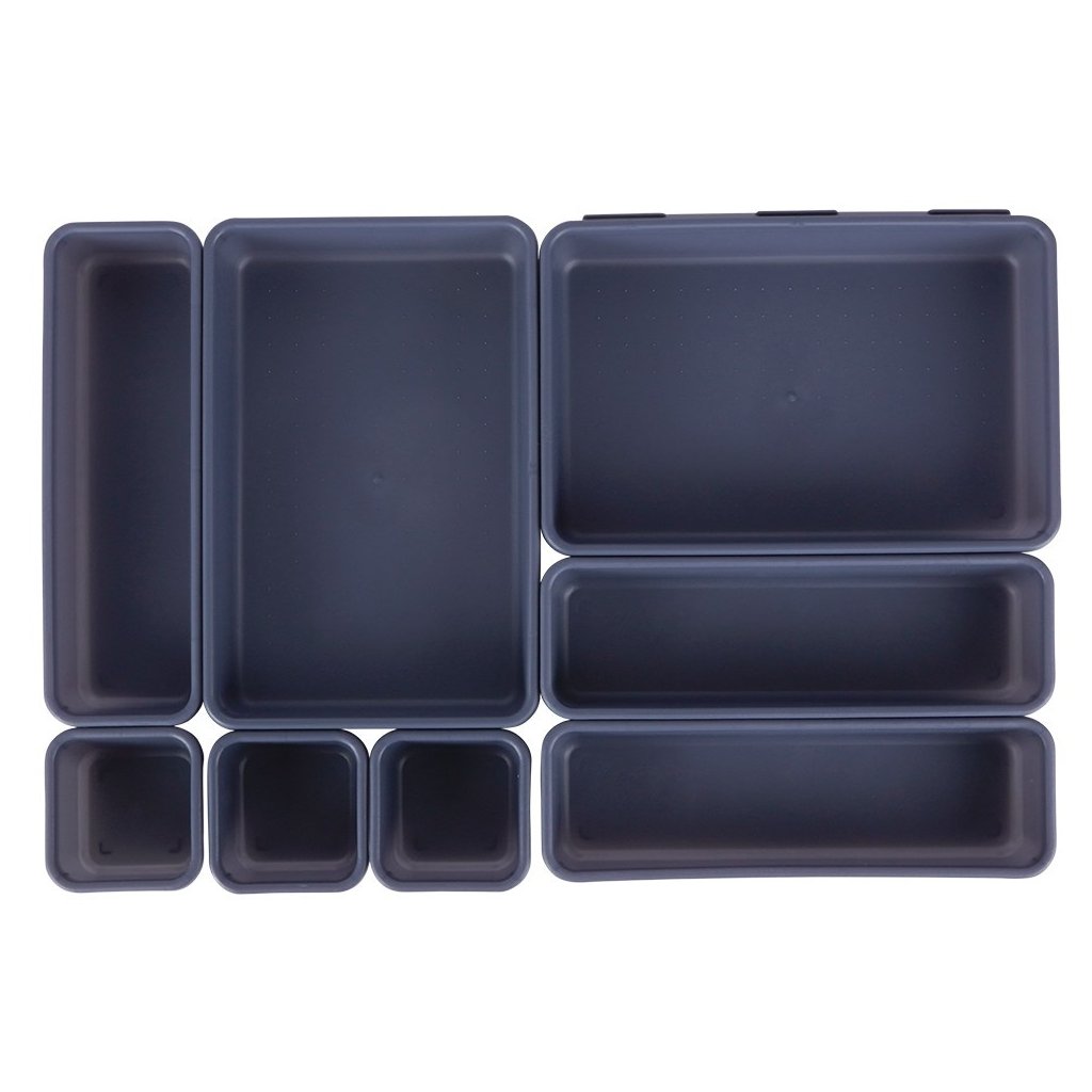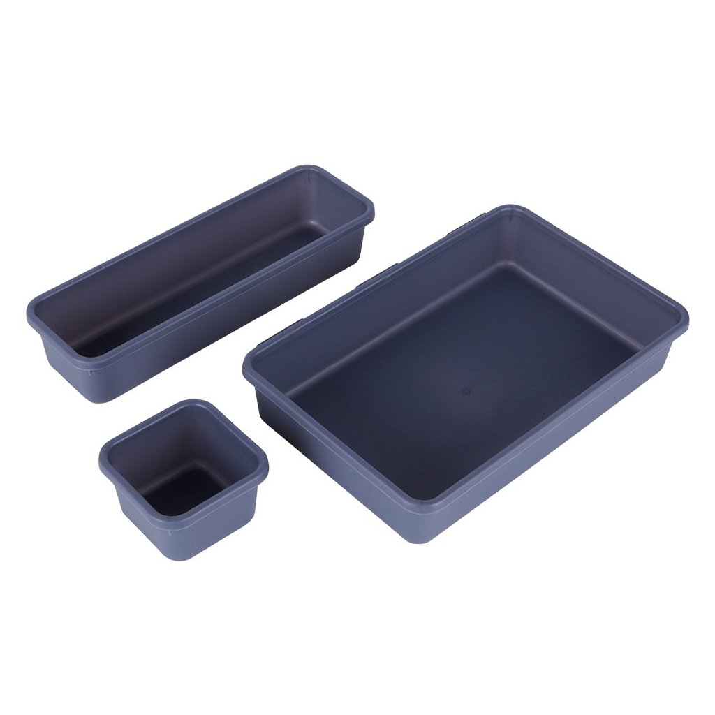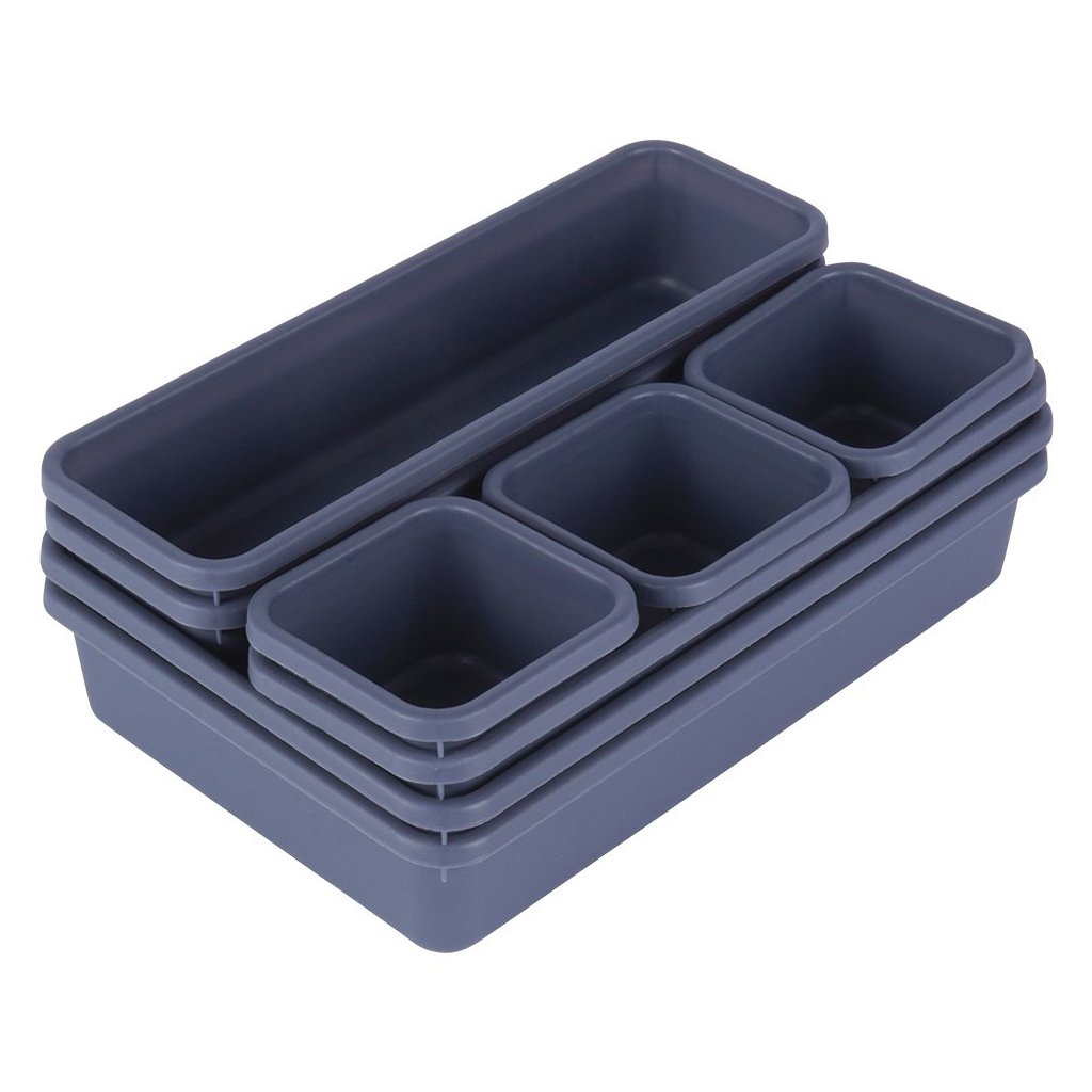 Sada osmi zásuvkových organizérů ve třech různých velikostech nabízí praktické a přehledné řešení pro ukládání kancelářských potřeb, drobného oblečení, kosmetiky i šperků. Díky modulárnímu designu lze jednotlivé organizéry libovolně kombinovat a přizpůsobit každé zásuvce.