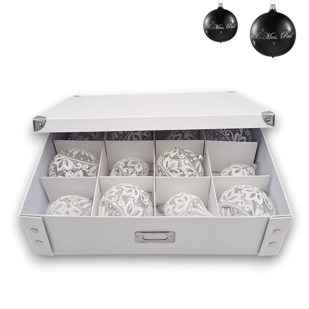 - 12 oddělených přihrádek: Každá přihrádka má rozměr cca 10 × 11 cm a poskytuje dostatek prostoru pro různé ozdoby, zabraňuje jejich vzájemnému dotyku a poškození.