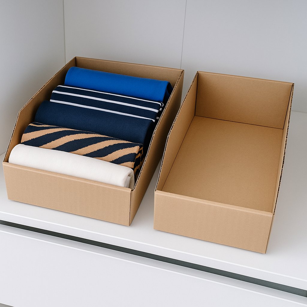 Efektivní organizace ve stylu Marie Kondo! Zapomeňte na chaos v šatní skříni a vytvořte si praktický a přehledný prostor s našimi ekologickými úložnými boxy. Díky promyšlenému designu promění tyto boxy vaše nepřehledné police na systém zásuvek, kde budete mít každý kousek oblečení na dosah ruky. Už žádné zapomenuté spodní vrstvy nebo oblečení zmačkané v koutě!